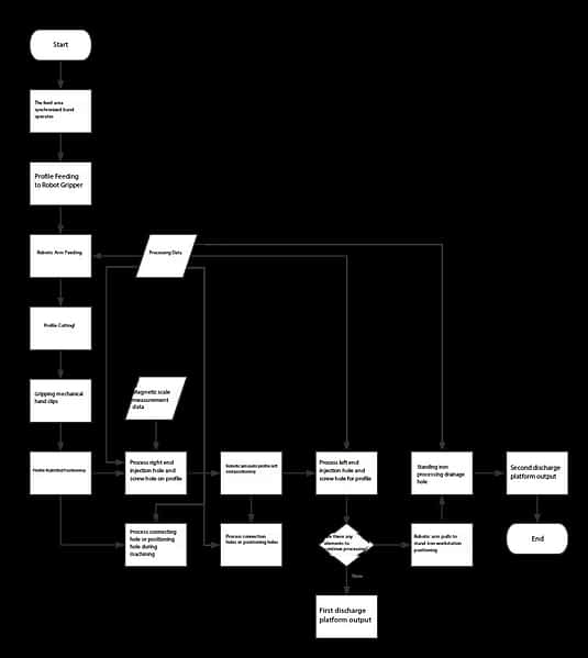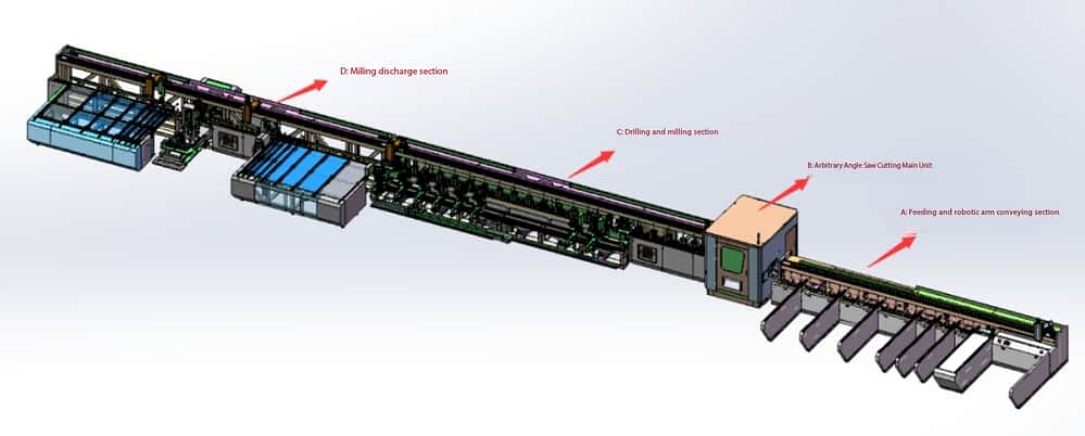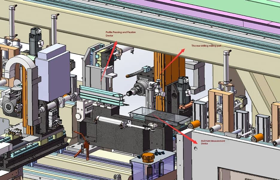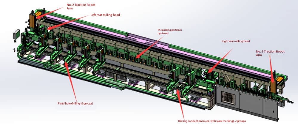 The production line is automatic production mode, multiple stations can be processed at the same time, when the length range is in the range of 360 mm ~ 3200 mm, the processing of each station does not interfere with each other; When the processing length range is in the range of 3200mm-5000mm, due to the processing space of each station, in order to avoid mutual interference, the sequence of processing is required between each station, and the production efficiency may be reduced. Because the milling drainage hole speed is relatively slow, and the number of drainage holes is generally large, the workplaces are arranged to the last. When the milling workplaces have processed types, the front workplaces can not stop processing.
