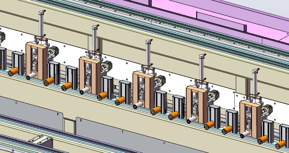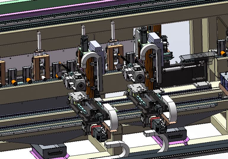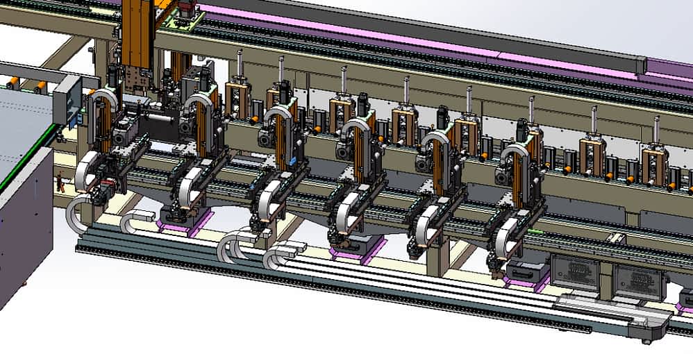 The tray extrusion tightening part is arranged in three areas: six sets of fixed profiles to be cut are arranged before the right milling head; There are 14 groups arranged between the left and right millheads, and the pallet tightening device under system control only tightens within the length range of the mold, and does not move outside the length area.