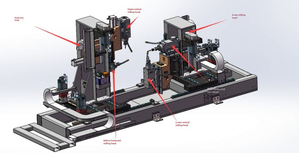 The four-axis standing milling position consists of two groups of milling heads: the front milling part and the back milling part. The front milling head is partially configured with a vertical milling head and a front horizontal milling head, which can complete element processing on the top and inner surface of the mold. The rear milling head is partially configured with a rear horizontal milling head and a lower vertical milling head, which can complete the element processing on the rear side and below the mold. In order to maximize production efficiency, two milling heads can be chosen to simultaneously process (upper vertical + lower vertical) according to the conditions of processing elements on the four sides of the mold. Up vertical + back horizontal; Lower vertical + pre-horizontal).