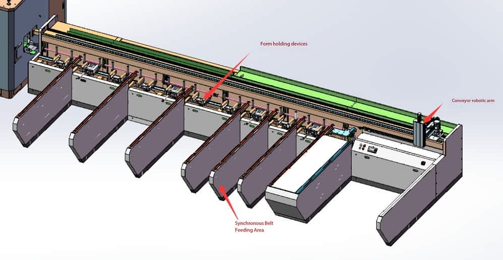The synchronous load cache area is mainly used to store profiles to be cut, and can store 6-8 profiles at the same time; The caching area can be set up so that workers can concentrate on loading to minimize the frequency of workers’ loading.