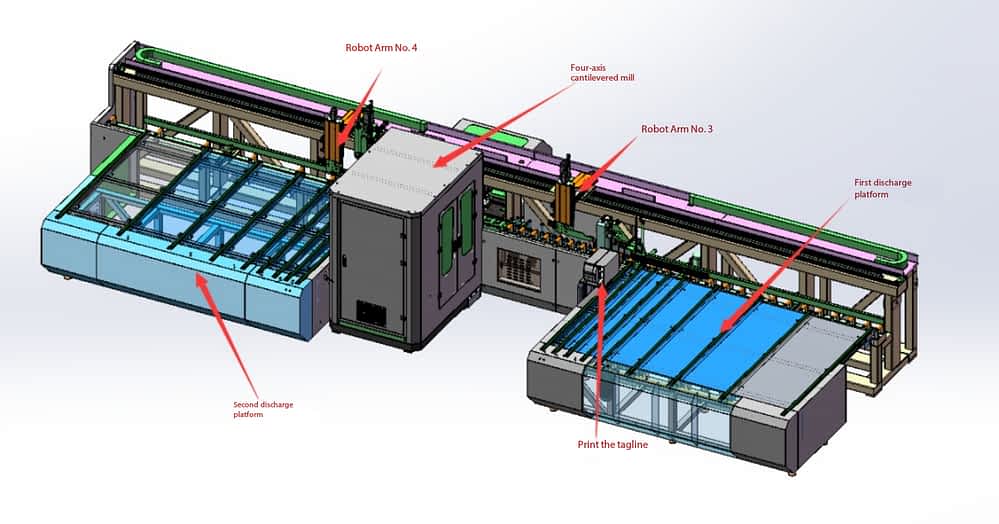 The milling feeding part consists of the following workplaces: First feeding table (right); Print the labeled workspace instantly; Four-axis drilling and milling position; Second loading platform (left); Towing a robotic hand; The pallet rack unit.