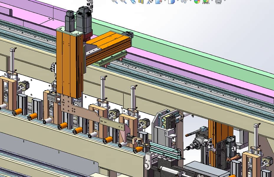 L Traction Manipulator: This part is equipped with two traction manipulators 3 # and 4 #。 4 # The mechanical hand adds an auxiliary mobile tightening device, which can adjust before and after moving to adapt to the changes in the tightening position of different types of materials.The auxiliary clamping device is suitable for secondary traction of the profile when the processed profile is larger than 3.2 meters.